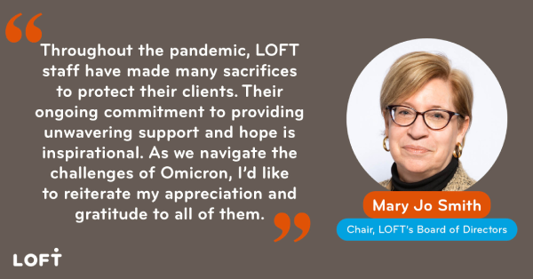 Your gift will help LOFT provide basic needs to our clients, such as food. When someone is in crisis, responding to their immediate needs — such as a fortifying meal — can help them focus on their recovery and often rekindle the desire to start a new chapter in life. With the cost of food continuing to rise, we anticipate requiring more than $1 million to provide food to our clients in 2022, making your support more important than ever.